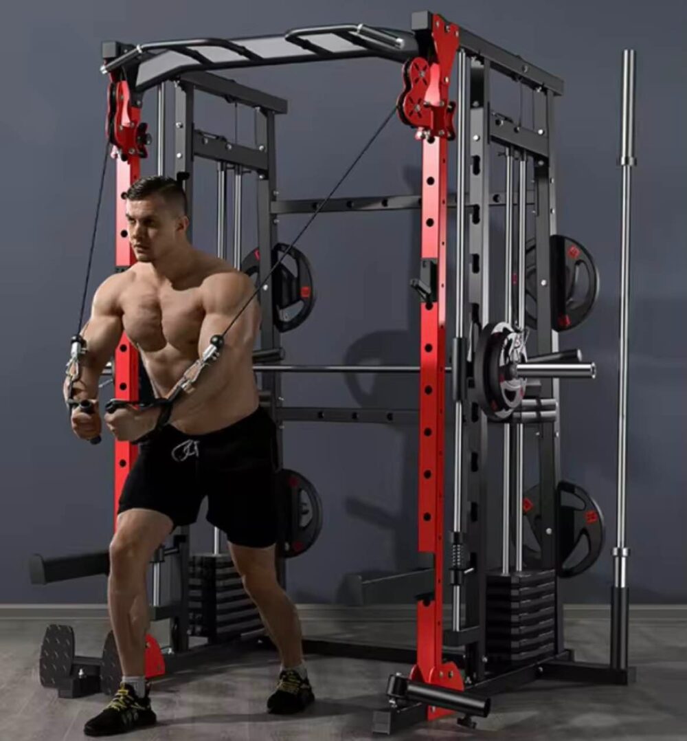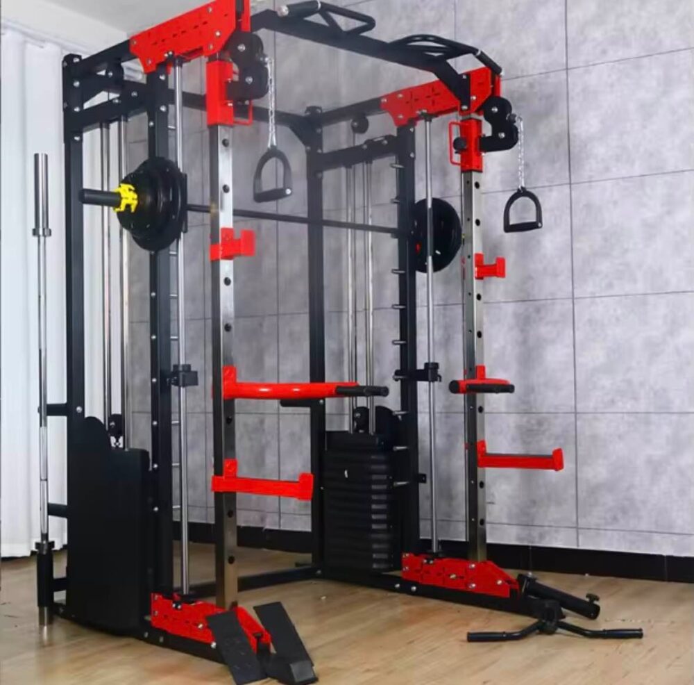 - Smith Machine: Safe, guided barbell path with commercial-grade linear bearings and built-in safety catches for max lifts without a spotter (e.g., Squats, Bench Press, Lunges).
